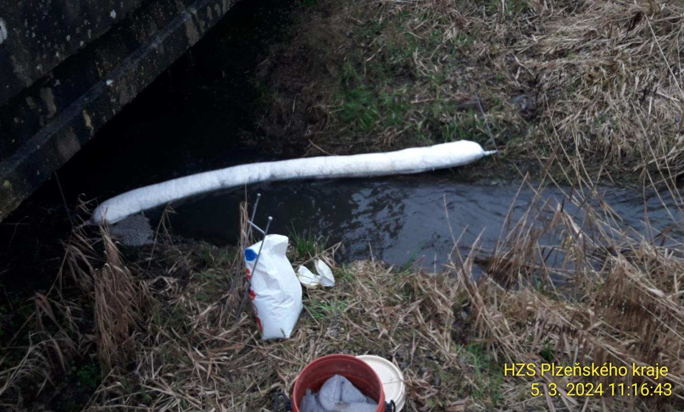 Hasiči vyjížděli na místo před 11. hodinou. "Ve Kdyni u čističky odpadních vod dochází k úniku ropné látky do Zahořanského potoka. Nainstalovali jsme norné stěny a sopční hady," uvedl mluvčí krajských hasičů Petra Poncar.