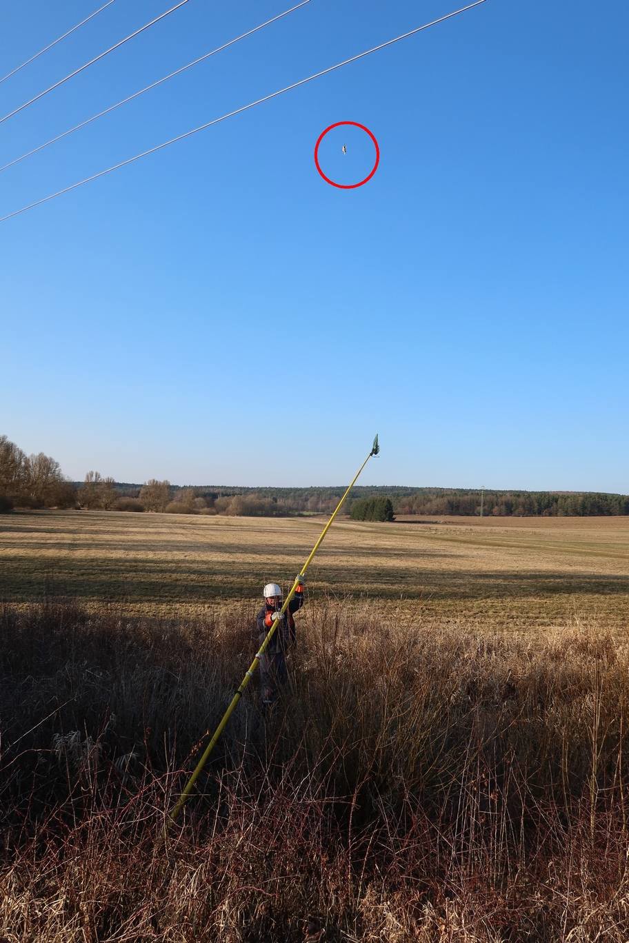 Klíčový okamžik nastal po příjezdu technika energetiky. Ten musel pracovat s maximální opatrností. Za pomoci speciální dlouhé izolační tyče se pokusil sýkoru z vlasce vysvobodit. Ačkoliv se jednalo o drobný cíl ve velké výšce, trpělivost se vyplatila.