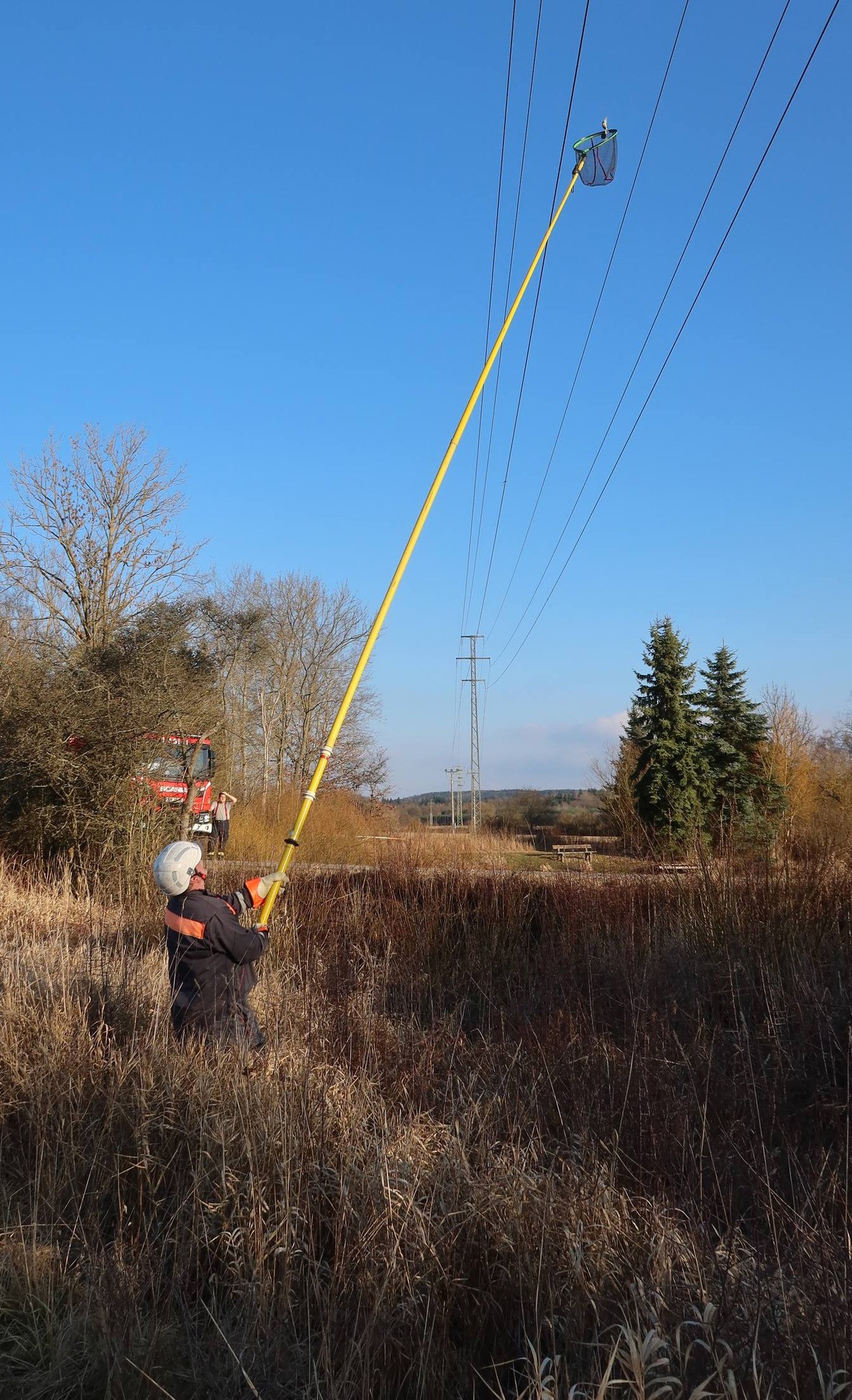 Nálezkyně okamžitě kontaktovala ochránce zvířat, kteří po zhodnocení situace z fotodokumentace seznali, že bez těžké techniky a odborníků je záchrana nemožná. Vzhledem k tomu, že ptáček uvízl v těsné blízkosti „živých“ vodičů vysokého napětí, byla na místo přes tísňovou linku 150 přivolána jednotka profesionálních hasičů.