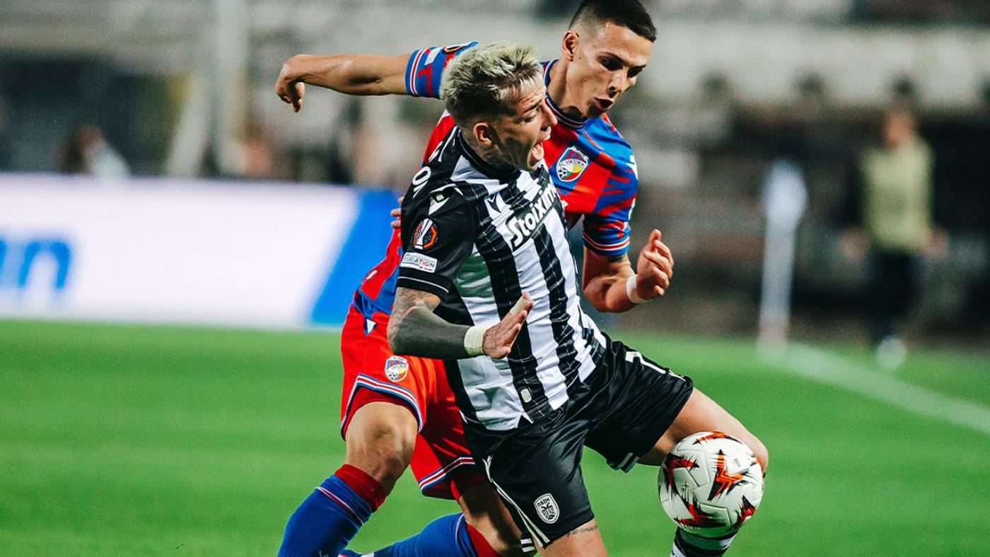 Viktoria začala zápas na řecké půdě úplně stejně jako o víkendu v Ostravě, a to velmi rychlým gólem. Jenomže oproti zápasu na Baníku tento gól neplatil. Míč do branky dostal Adu, ale rozhodčí po zásahu VARu odpískal ofsajd a pokračovalo se tak bez branek. Za bouřlivé atmosféry se hra odehrávala spíše ve středu hrací plochy a šance nepřicházely. Vše se změnilo ve 31. minutě, kdy Viktoria znovu gólově udeřila. Ze spolupráce Cadua s Aduem těžil Milan Havel. Ten zůstal na zadní tyči nikým nehlídaný a také to potrestal. Balon chladnokrevně poslal pod horní tyč a poslal Plzeň do vedení. To ale nebylo všechno. O osm minut později se trefil Matěj Vydra. Adu se prodral až do vápna, kde vystřelil. Jenže domácí brankář střelu vyrazil jen před sebe, kde byl pohotový Matěj Vydra a míč dorazil do branky. Červenomodří si tak odnesli do kabiny dvoubrankový náskok.