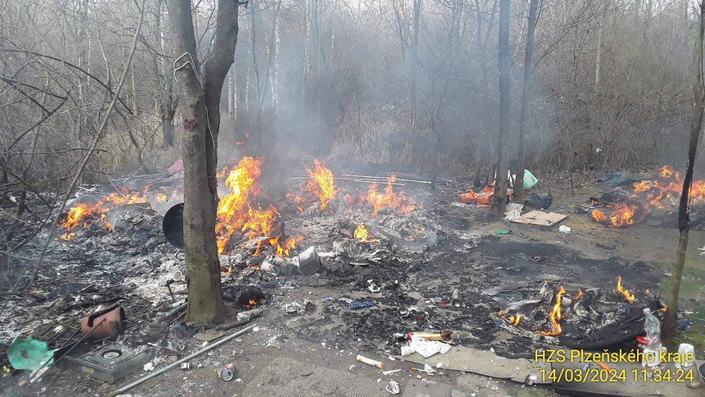 Aktualizováno 12:40 Tzv. kemp bezdomovců nacházející se za nemocnicí Privamed a fotbalovým hřištěm na Vinicích zachvátil dnes dopoledne požár. Vážně popálenou ženu transportuje do nemocnice vrtulník.