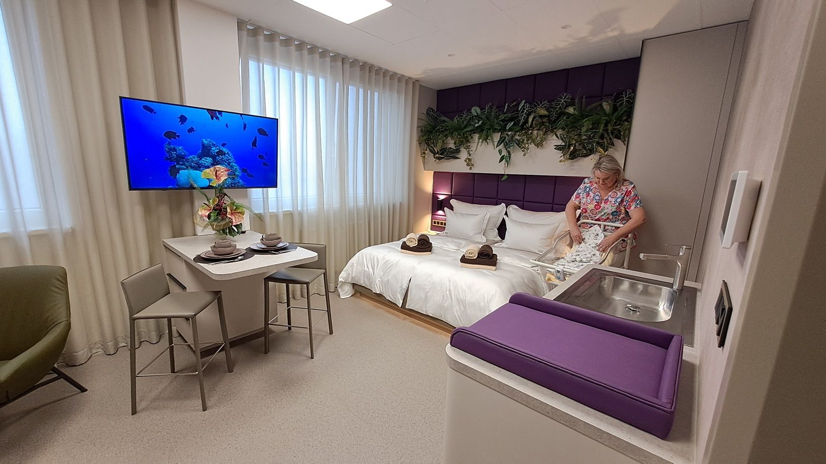 Kromě kuchyňky, která je zabudovaná do skříně, je součástí pokoje i přebalovací pult, vanička, rozkládací pohovka (pro pobyt prvorozeného sourozence) se stolkem, menší jídelní stůl, televizor i možnosti různého osvětlení. Dále manželská postel a samozřejmě toaleta se sprchovým koutem a umyvadlem.