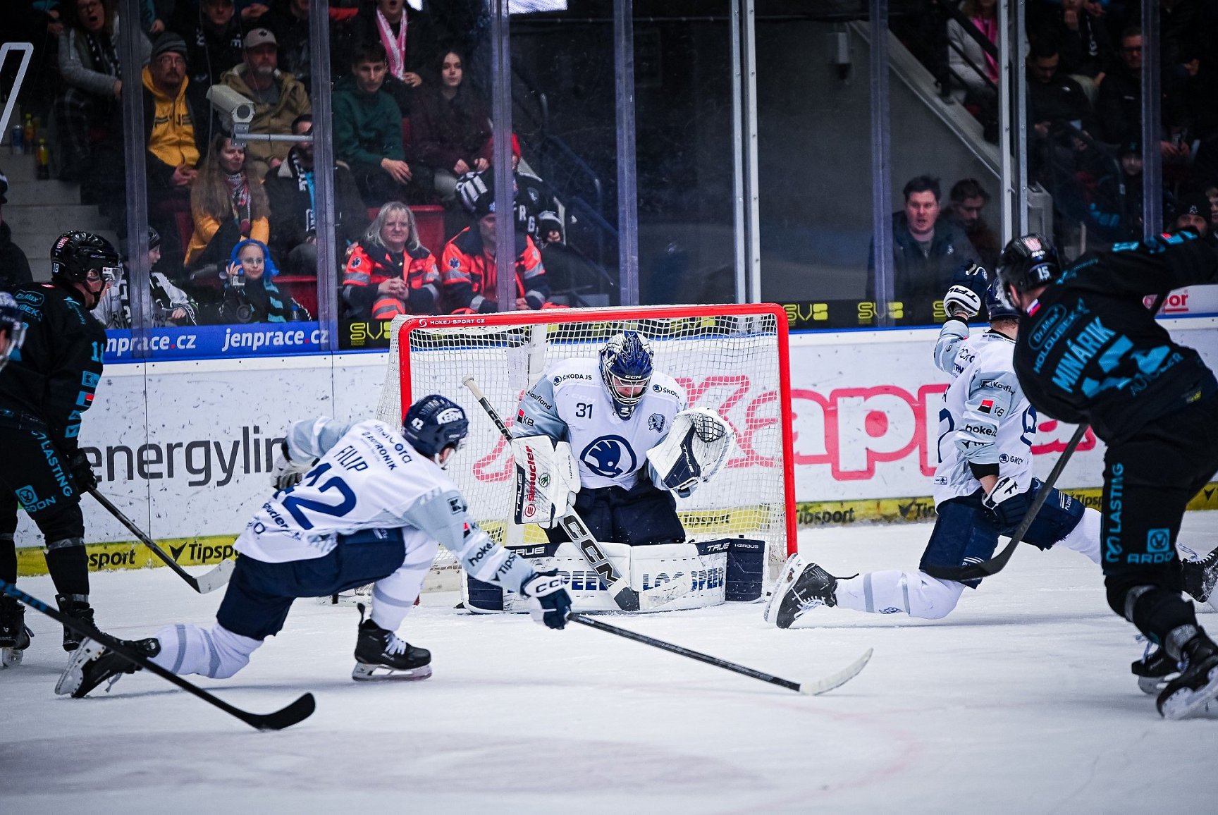 Hráli ve čtyřech, věděl jsem, že tam bude přečíslení u branky. Jejich hráč to dostal žabičkou před bránu. Byl blízko mě, takže jsem si byl jistý, když jsem mu zavřel prostor, že mě nebude mít kam přehodit. Pomohli mi i kluci samozřejmě v zápase, kteří nedávali tolik prostoru na hráčům Energie na zakončení.