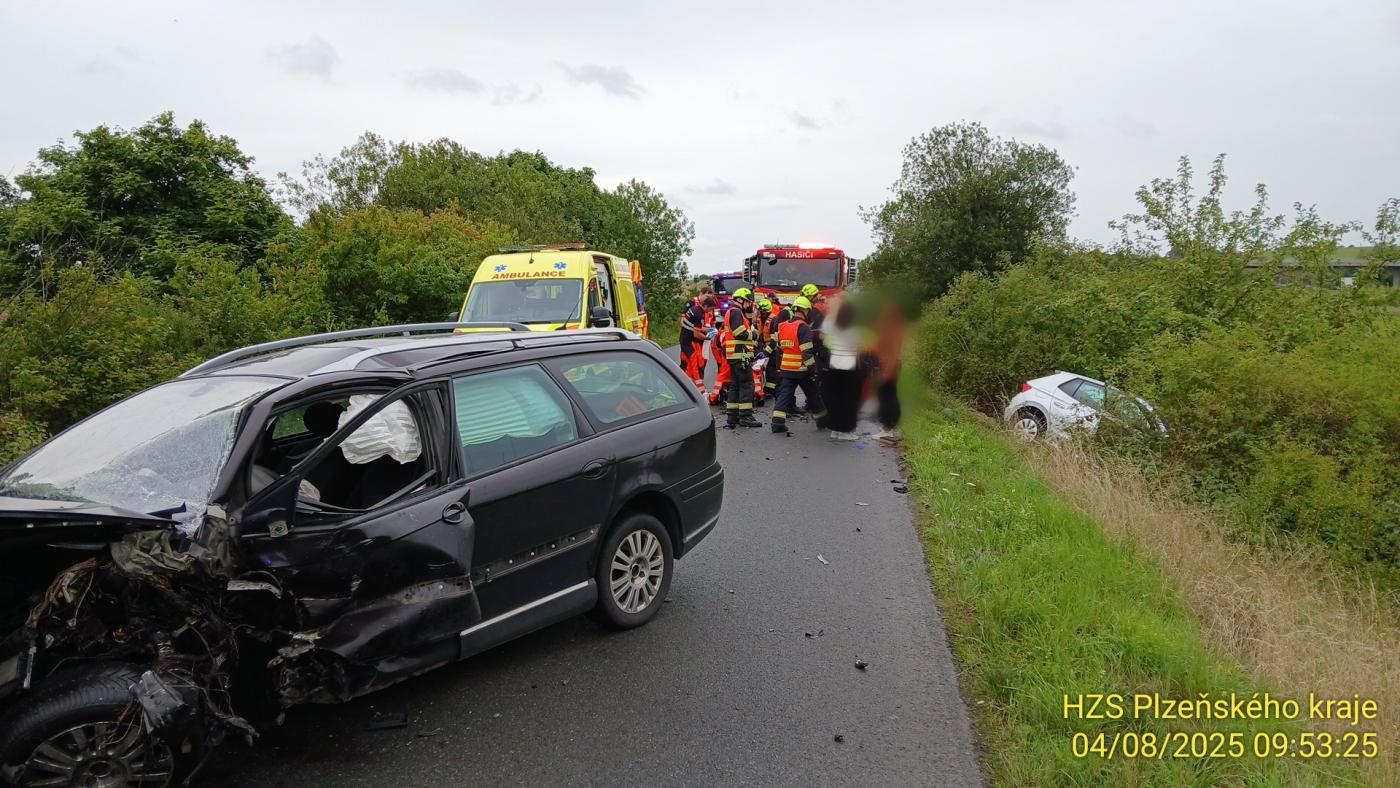 Dvě osobní auta se srazila na silnici spojující Plzeň - Výsluní a přivaděč k Přešticím. Dva lidé se zranili, z toho jeden z nich středně těžce. Jednu osobu museli hasiči vyprostit pomocí hydraulických nástrojů.