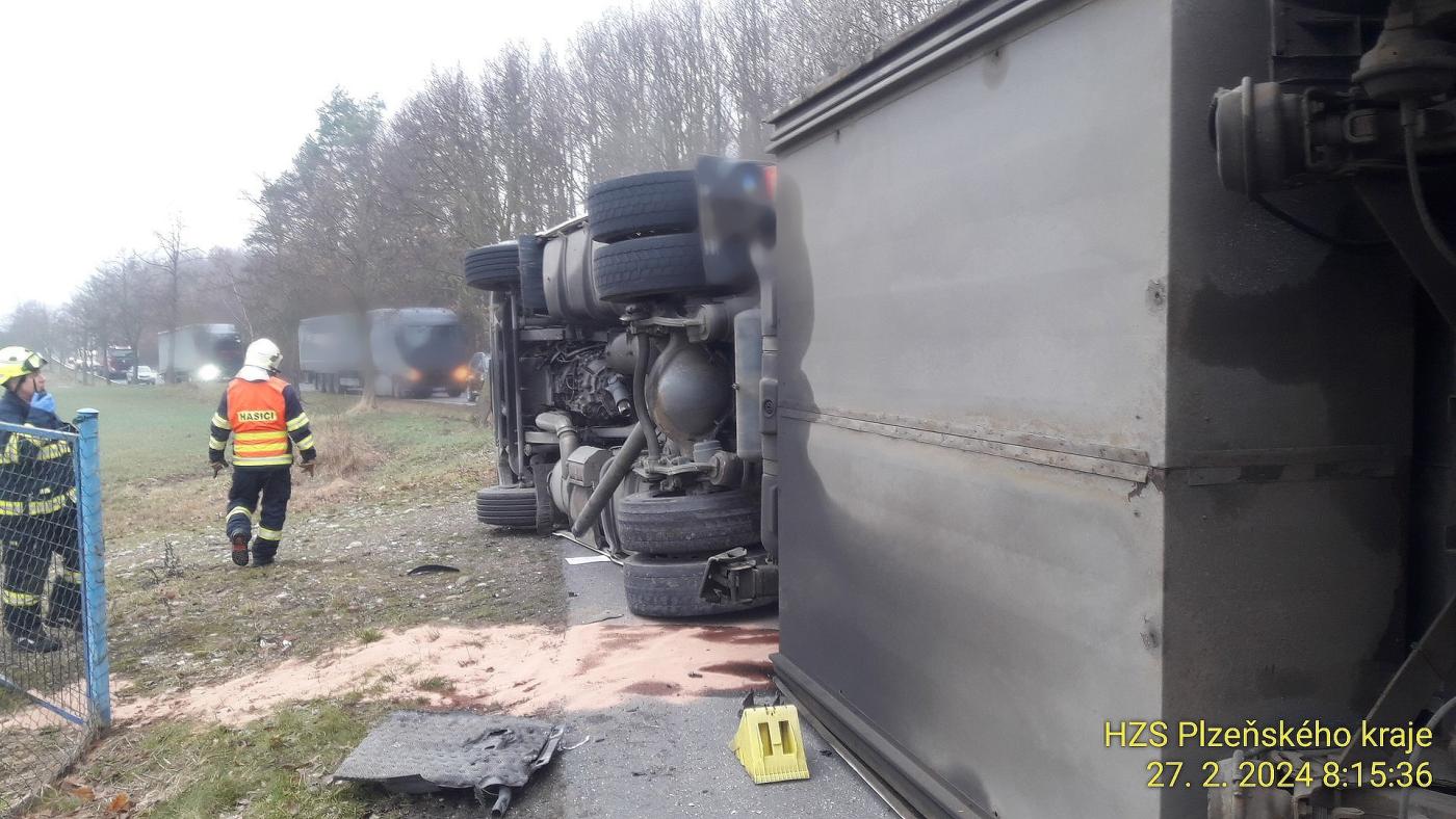 Mezi Mirošovem a Příkosicemi na Rokycansku havaroval kamion s návěsem, který převážel masné výrobky. Řidič utrpěl lehčí zranění, silnice musela být uzavřena.