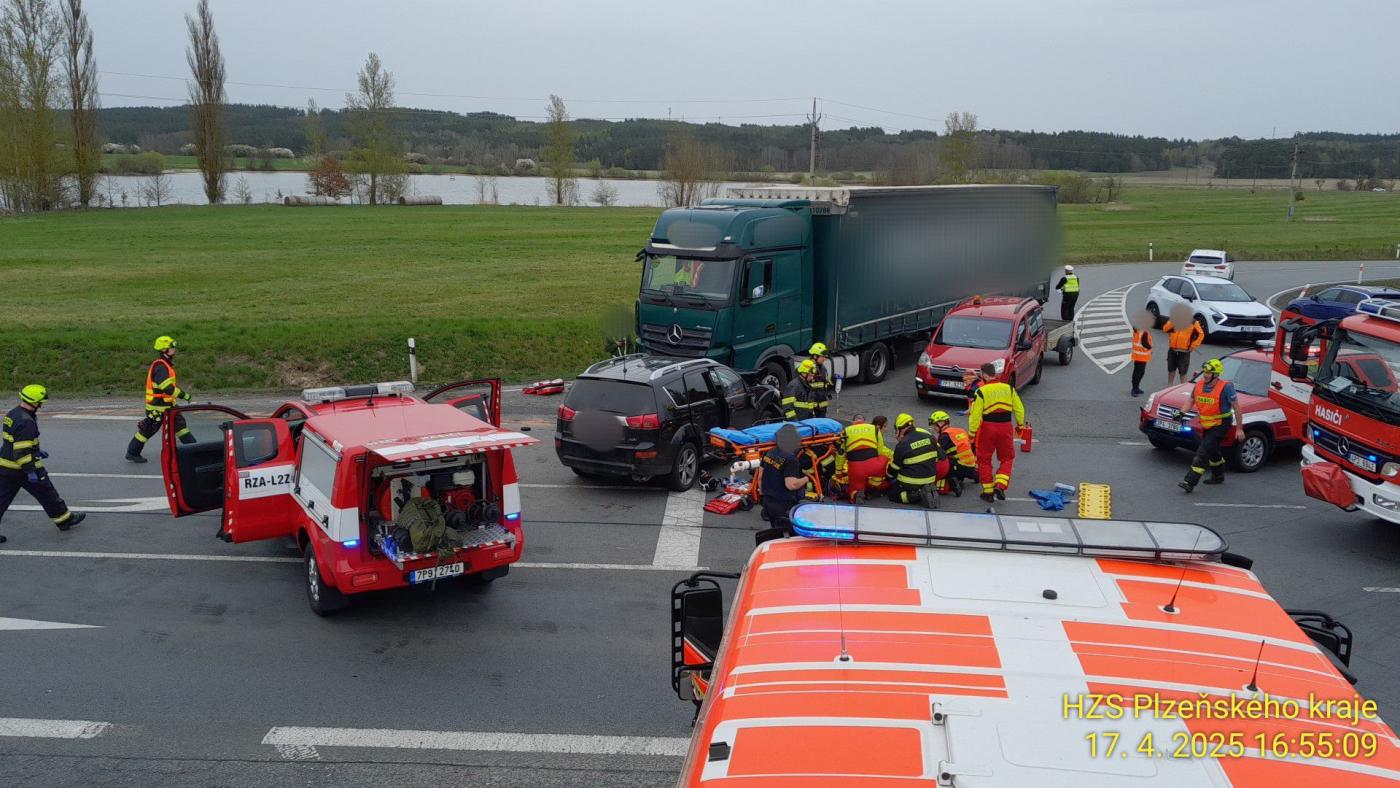 Dvě vozidla SUV a kamion se srazily dnes odpoledne u Nové Hospody na Tachovsku. Čtyři lidé včetně dítěte skončily v nemocnici, pro vážně zraněného muže letěl vrtulník.