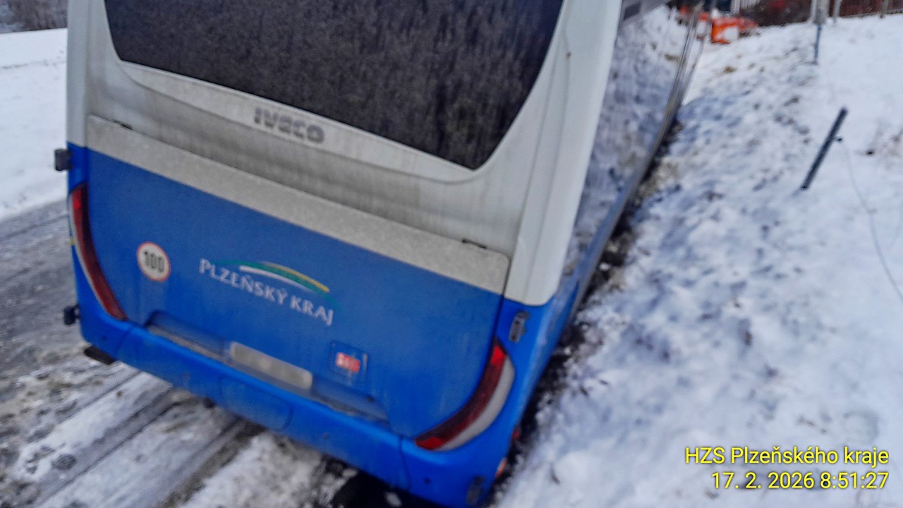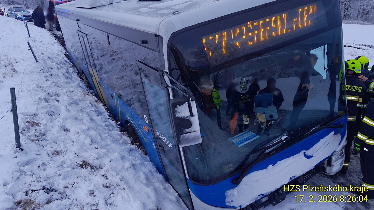 Autobus převážející skupinu dětí sjel na silnici II/171 u obce Strašín ze silnice do příkopu, kde zůstal ležet na boku. Hasiči museli cestující dostávat z vozidla okýnkem u řidiče.