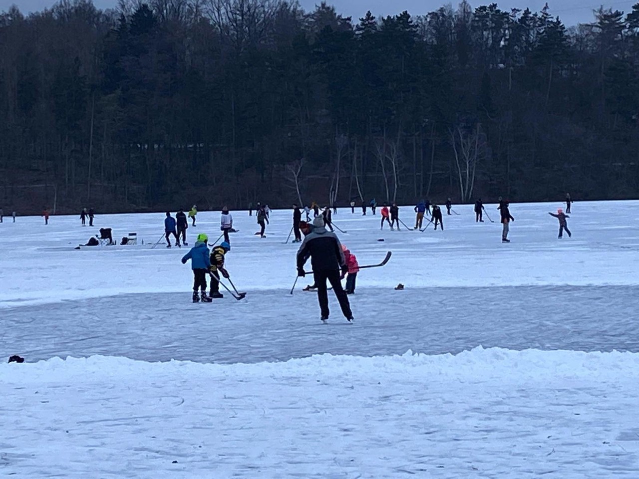 Plovoucí pontony, které v létě slouží rekreantům a v zimě nesou vánoční strom, získaly s příchodem mrazů novou funkci. Zamrzly v ledu tak pevně, že nyní bruslařům slouží jako ideální místo pro odpočinek nebo přezutí bruslí.
