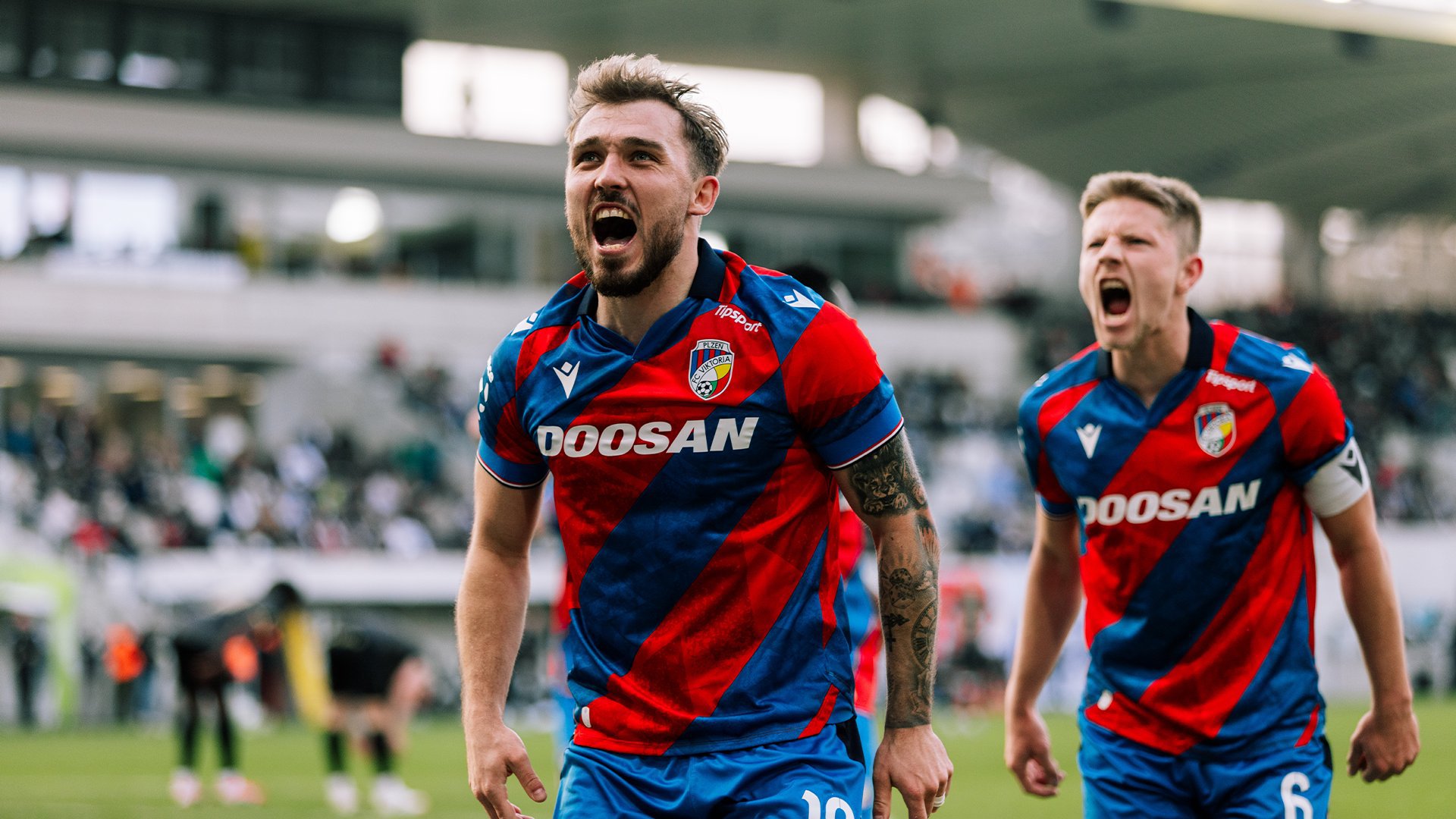 První šanci měla Viktoria už ve 2. minutě, kdy zkusil střelu z dálky Souaré, jeho pokus byl ale ztečovaný a následoval rohový kop. Krčík poté hlavičkoval míč nešťastně za sebe na Mihálika, který se pokusil o obstřel, ale pozorný Wiegele byl připravený. V 6. minutě se Viktoria dostala ke slibné příležitosti na hranici vápna, zakončení se jí ale nepodařilo. O čtyři minuty později Krčík zastavil dobře se vyvíjející akci soupeře. Ve 14. minutě to znovu zkusil z dálky Souaré, tentokrát ale jeho pokus pokryl pozorný Zadražil. V 16. minutě se krásně uvolnil Doski, nasadil soupeři jesle a byl následně faulován. Z následné standardní situace pálil přímo na bránu Hrošovský, jeho střela ale skončila pouze na břevně. Ve 33. minutě vytáhl Wiegele povedený zákrok, když se dokázal natáhnout na tečovanou střelu zpoza vápna. Do konce poločasu se hrál otevřený fotbal nahoru dolů, oba týmy si vytvořily několik náznaků šancí, ale bez brankového efektu. Ve 44. minutě však přišel rozhodující moment. Lawal potrestal dlouhé vyběhnutí brankáře, elegantním obloučkem ho přehodil a otevřel skóre zápasu. Viktoria tak šla do šatny s jednobrankovým vedením.
