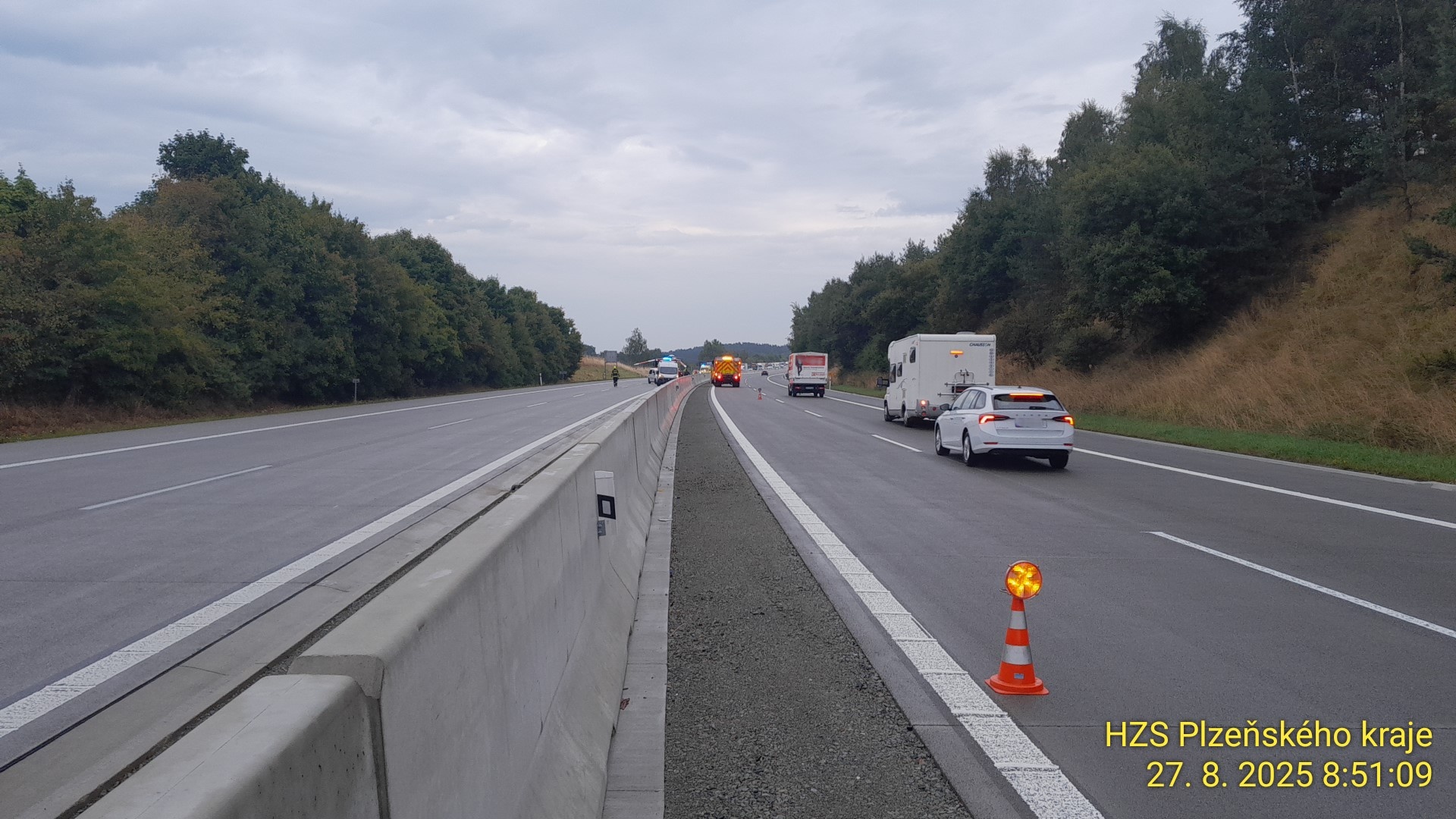 Nehoda se stala mezi exity 119 Benešovice a 128 Bor. "Zhruba padesátiletého muže jsme na místě spolu s leteckou záchrannou službou ošetřili, zajistili a předali dále do péče," potvrdila mluvčí krajských záchranářů Andrea Divišová.