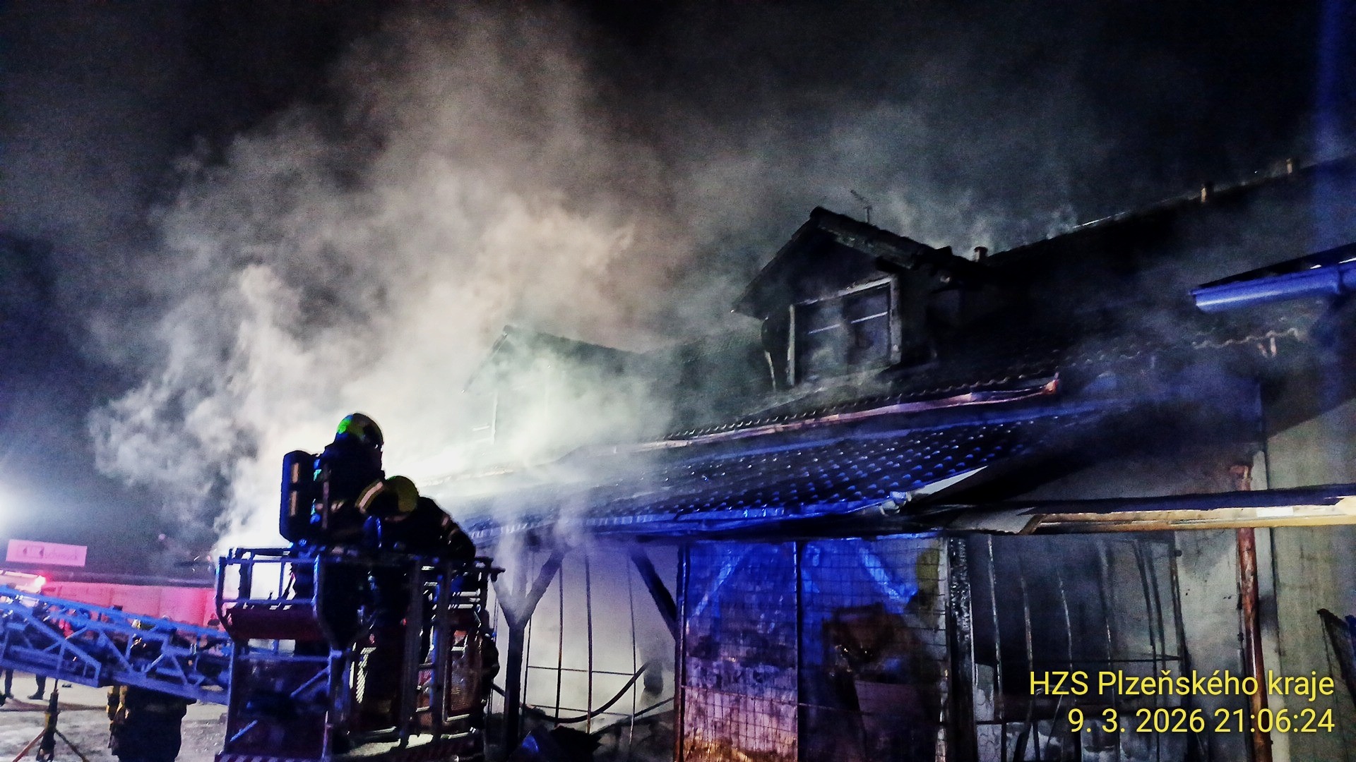 V pondělí večer zasahovalo několik jednotek hasičů v areálu tržnice v Horní Folmavě na Domažlicku. Plameny zachvátily dřevěný přístavek u patrové zděné budovy, která slouží k podnikání. Zásah komplikovaly obavy o životy osob, které se mohly nacházet uvnitř.