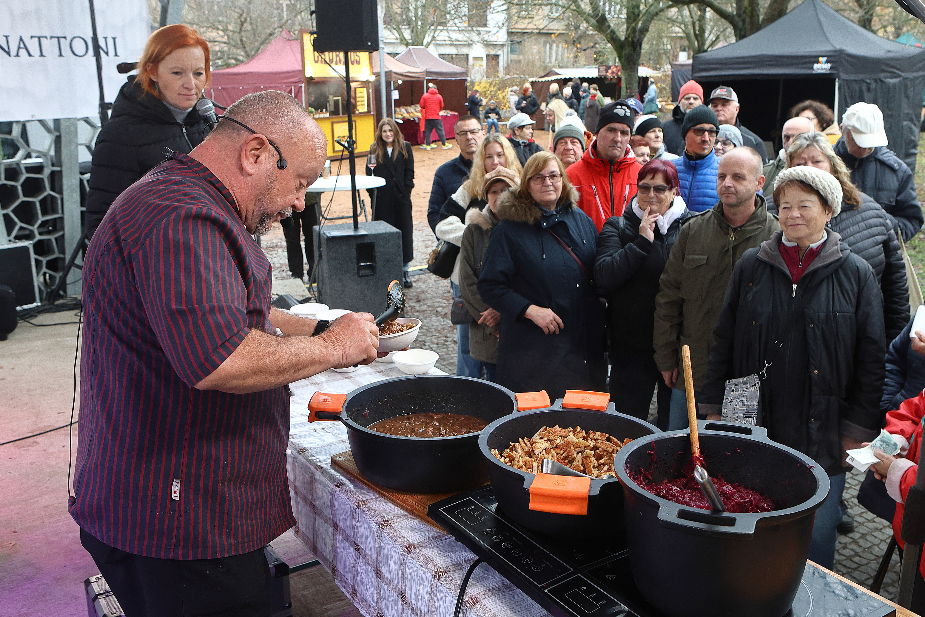 Lidé měli největší zájem o tradiční svatomartinskou husu se zelím a knedlíky, zmizelo více než 300 porcí. Na odbyt šly také bramborové lokše s trhaným husím masem. Servírovány byly ale také vybrané speciality, například hamburger s husím masem. Šéfkuchař Petr Stupka v rámci kulinářské show na pódiu připravil husí maso s netradičně připraveným červeným zelím a cizrnovými placičkami smaženými na husím sádle. „Placičky vycházejí z receptu, který se mi podařilo najít v archivu z období 16. století, kdy na jihu Čech vládli Rožmberkové. Tehdy se jim říkalo římské placky. Můžeme je přirovnat k našim bramborákům, ale z cizrny. Úprava zelí pochází z 19. století. Zelí se v tomto případě podlévá vínem, přidávají se k němu jablka, strouhaný brambor, trošku skořice a citronové a pomerančové kůry,“ popisuje šéfkuchař Petr Stupka. „Servírována byla mladá a Svatomartinská vína od menších i větších vinařů. Jak je vidět, lidé mají tuto tradiční akci rádi. Vždycky tu panuje výborná atmosféra,“ dodává místostarosta Jan Kakeš. A jaká vlastně Svatomartinská vína jsou? Jde o svěží, ovocitá a suchá vína, která musejí být vyrobena pouze z vybraných raných odrůd, musejí projít schvalovacím procesem speciální komise a být opatřena speciální svatomartinskou samolepkou. Bílými svatomartinskými víny může být Veltlínské červené rané, Muškát moravský a Müller Thurgau. Červená Svatomartinská vína pak máme pouze ze dvou odrůd, a to Svatovavřinecké a Modrý Portugal. Z těchto odrůd mohou být také růžová Svatomartinská vína. Ta mohou být i z oblíbené odrůdy Zwiegeltrebe.