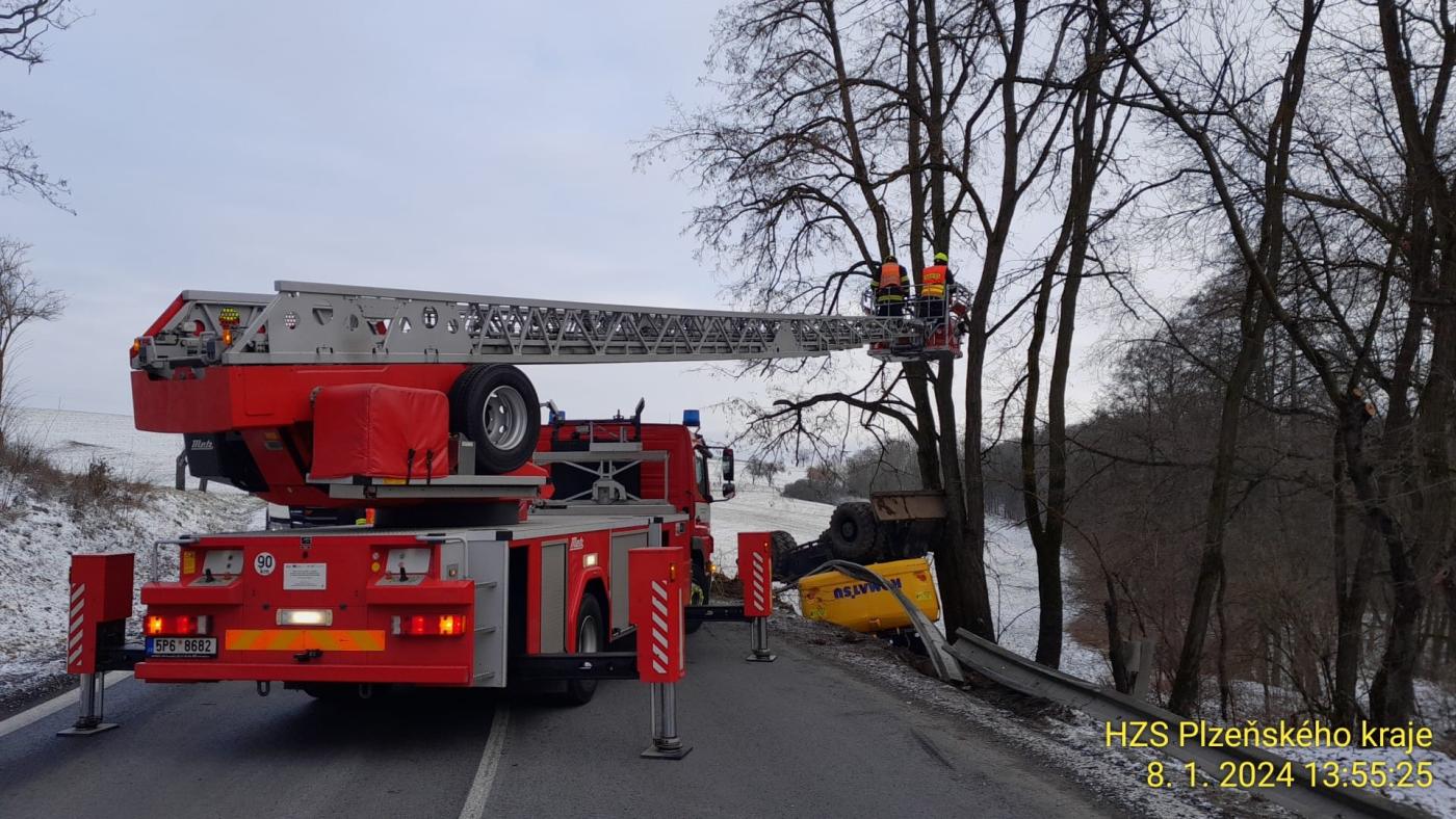 "Řidič ročník 1974 nákladního vozidla tovární značky Scania jel ve směru od obce Domažlice na obec Kdyně. Při projíždění ostré levotočivé zatáčky se mu uvolnil na namrzlém podvalníku náklad. Převážel pracovní stroj, čímž došlo k přetrhání kurtů a řetězů uchycující náklad a k následnému pádu převážejícího pracovního stroje vpravo do silničního příkopu," popsala policejní mluvčí Barbora Šmaterová.