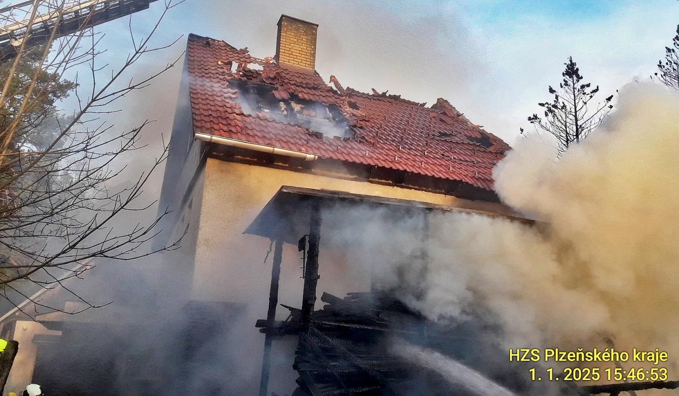 Osm hasičských jednotek zasahovalo u požáru chaty v Kvášňovicích na Nový rok odpoledne. "Původně byla událost nahlášena jako požár dvou dřevníků, který se ale následně přenesl na zděnou chatu a zasáhl střechu a podkroví," uvedl mluvčí krajských hasičů Petr Poncar.