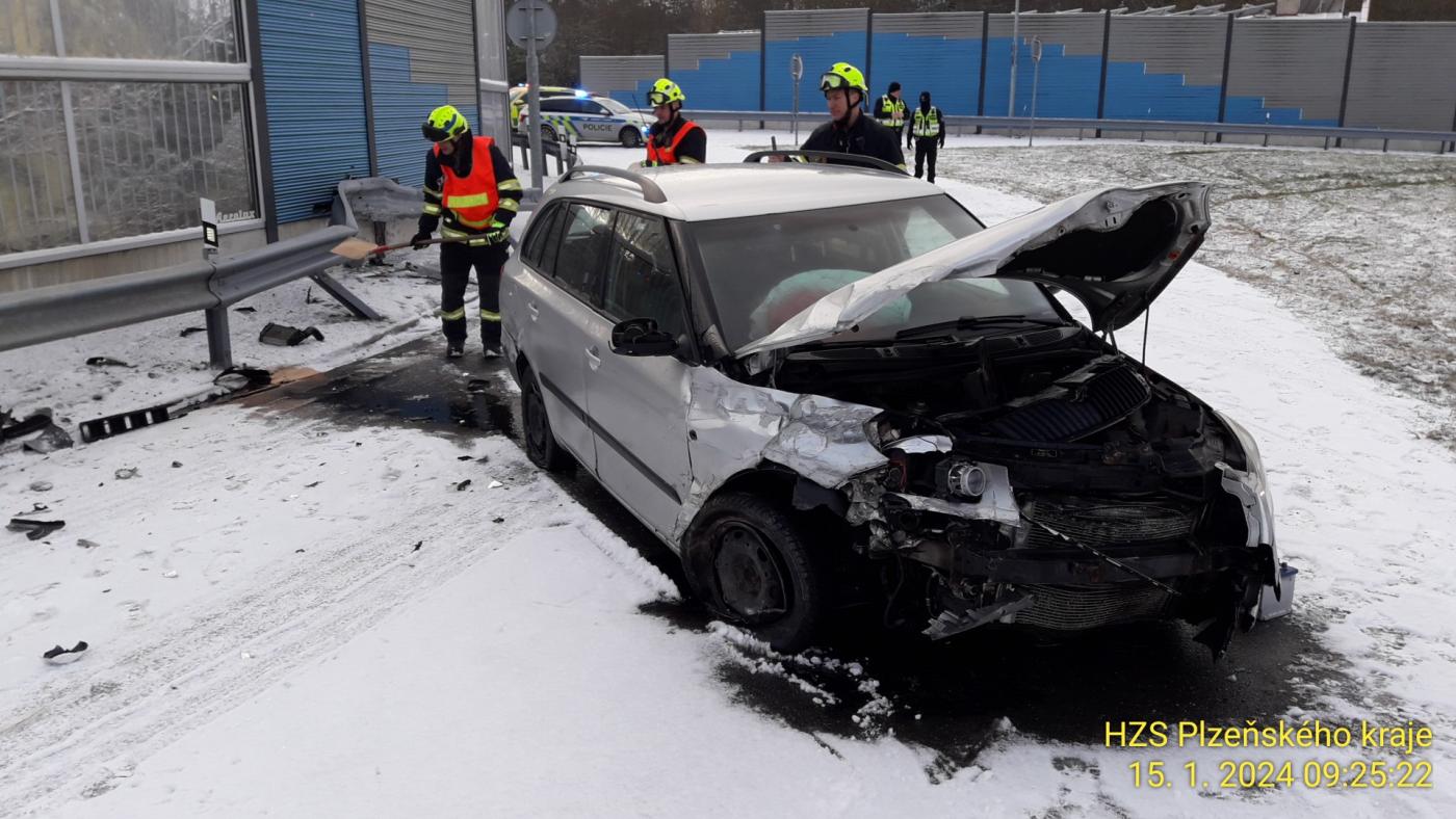 Namrzlá vozovka byla pravděpodobně příčinou i nehody osobního auta na přivaděči od Přeštic ve směru do Plzně na úrovni vodní nádrže České údolí. "Jeden jízdní pruh do Plzně byl uzavřen. Nehoda bez zranění s únikem provozních kapalin," vypočítal Poncar.