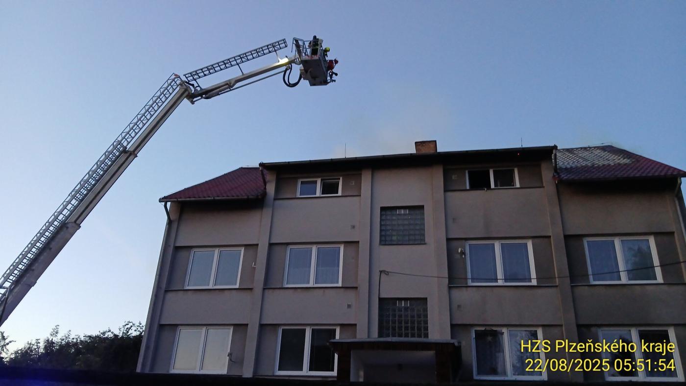 Požár vypukl krátce po 5. hodině ranní. "Zasahujeme v Chříči u požáru v horním patře a podkroví bytovky. Na místo zásahu vyjely jednotky z druhého stupně požárního poplachu. Zasahovali jsme i z výškové techniky," popsal mluvčí krajských hasičů Petr Poncar s tím, že hasiči rozebírají střechu a dohašují skrytá ohniska.