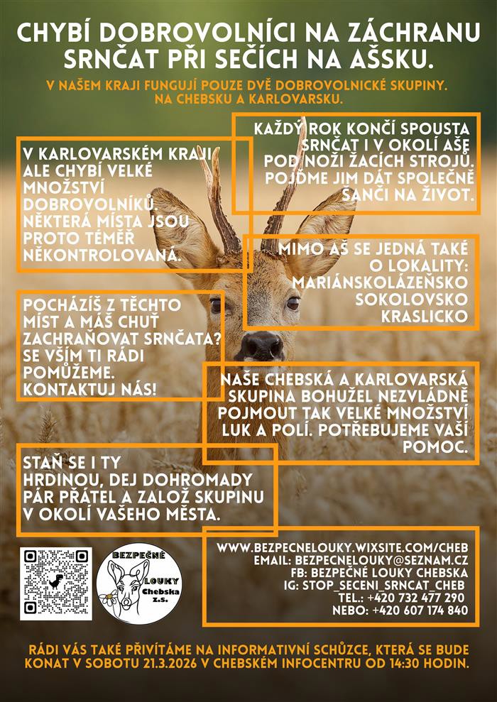 Pokud vás myšlenka záchrany srnčat zaujala, ale nevíte, jak začít, přijďte na informativní schůzku, která se uskuteční v sobotu 21. března od 14:30 v Infocentru Cheb. Dozvíte se vše potřebné o tom, jak vyhledávání probíhá. „Na programu bude seznámení s naší činností, informace o přípravách na letošní sezónu, ukázka našeho nového dronu s termovizí a mnoho dalšího,“ upřesnili organizátoři.