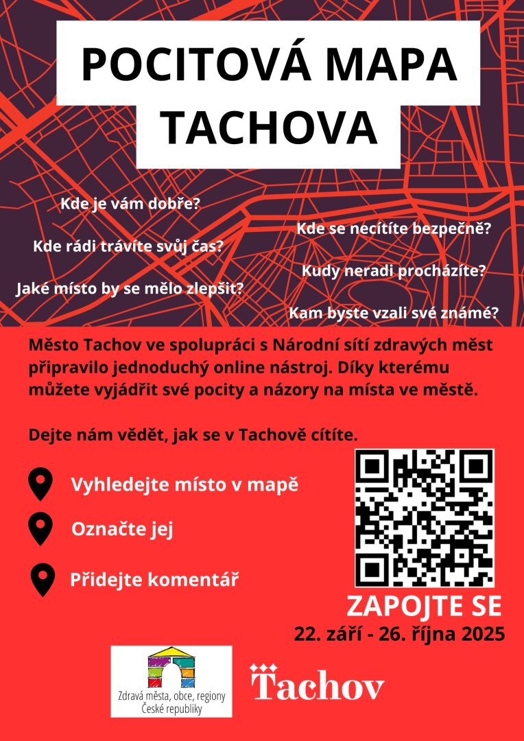 Ve spolupráci s Národní sítí zdravých měst nyní Tachov spouští pocitovou mapu. Tento online nástroj dává možnost jednoduše a anonymně vyjádřit, kde se lidé cítí dobře, kde se necítí bezpečně, nebo i to, kde by uvítali změnu. Vyplnění zabere jen pár minut a každý hlas má svou váhu. Pocitová mapa přinese důležitá data, která poslouží jako podklad pro budoucí rozvoj města, investice i údržbu veřejných prostranství. Čím více lidí se zapojí, tím přesnější obraz společně vytvoříme. Zapojit se do pocitové mapy mohou obyvatelé až do 26. října 2025 prostřednictvím webu pocitovamapa.nszm.cz/tachov-2025.