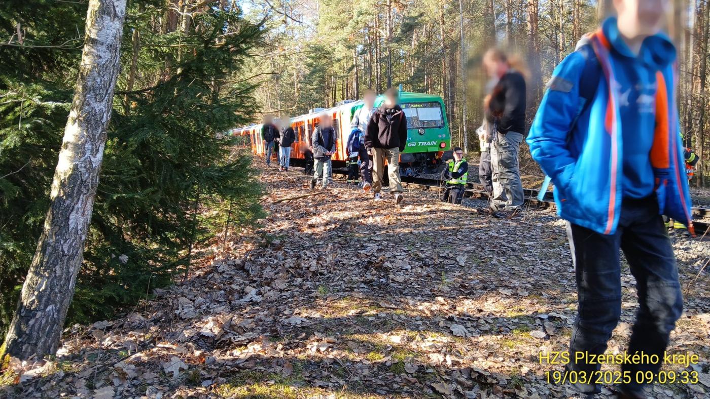 Mluvčí krajských hasičů Petr Poncar potvrdil, že v soupravě ke zraněním nedošlo. "51 osob bylo evakuováno do náhadního autobusu," uvedl s tím, že na místě je jednotka z Plas a hasiči Správy železnic. Provoz na trati je zastaven.