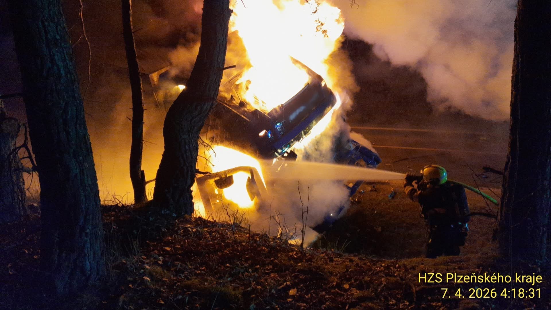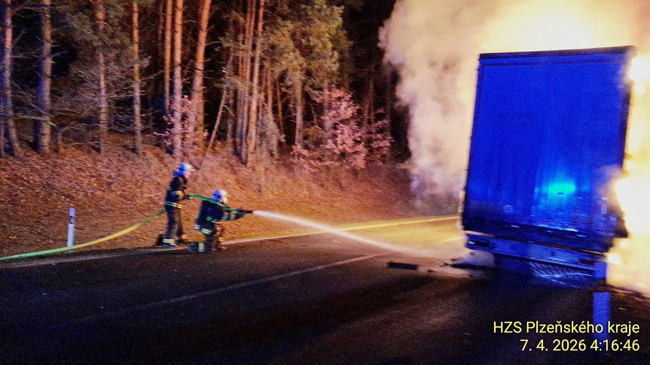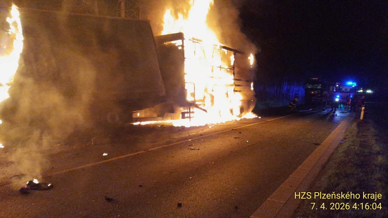 Podle mluvčího hasičů Petra Poncara se nehoda srala na 34,5 kilometru silnice zhruba na úrovni Holýšovského rybníku. "Došlo k nehodě a následnému požáru nákladního a osobního automobilu. K hašení obou vozidel jsme nasadili čtyři vodní proudy. Po uhašení požáru jsme z osobního vozidla vyprostili jedno tělo," dodal